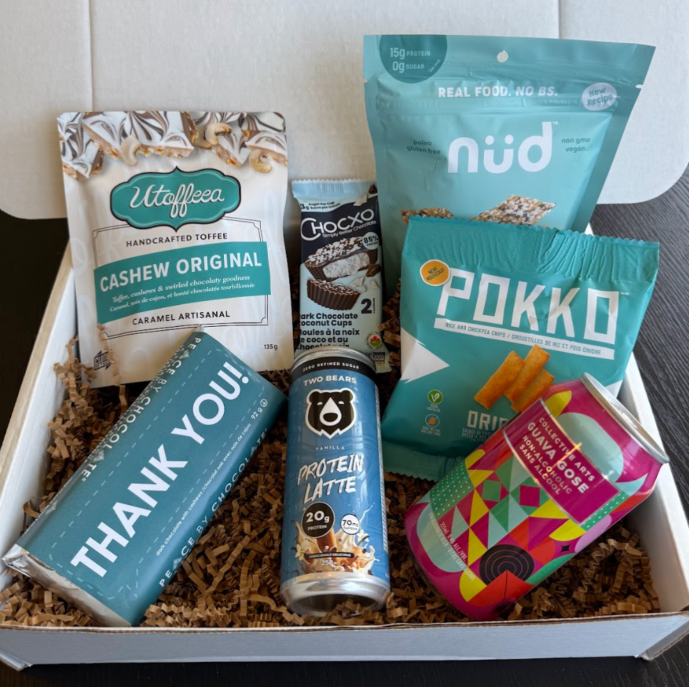 With sweet and salty inclusions, a protein-fueled drink and a decorative non-alcoholic beer, this box is perfect for appreciating remote workers or clients, or even as a meeting snack-box.