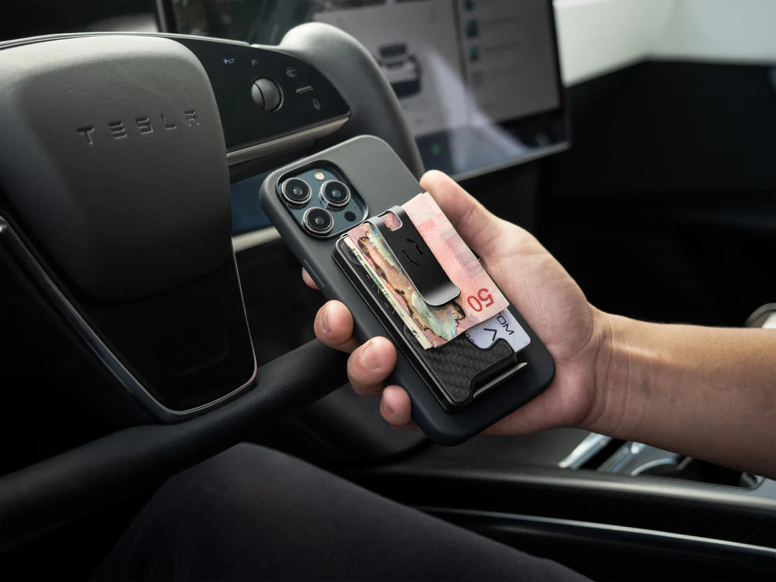 Built from aircraft grade aluminum with an anodized finish, the Fantom M Wallet features strong magnets and rubberized backing to attach securely to any MagSafe equipped mobile devices. Simply snap on the Fantom M Wallet to the back of your phone or a case with MagSafe for a whole new experience!