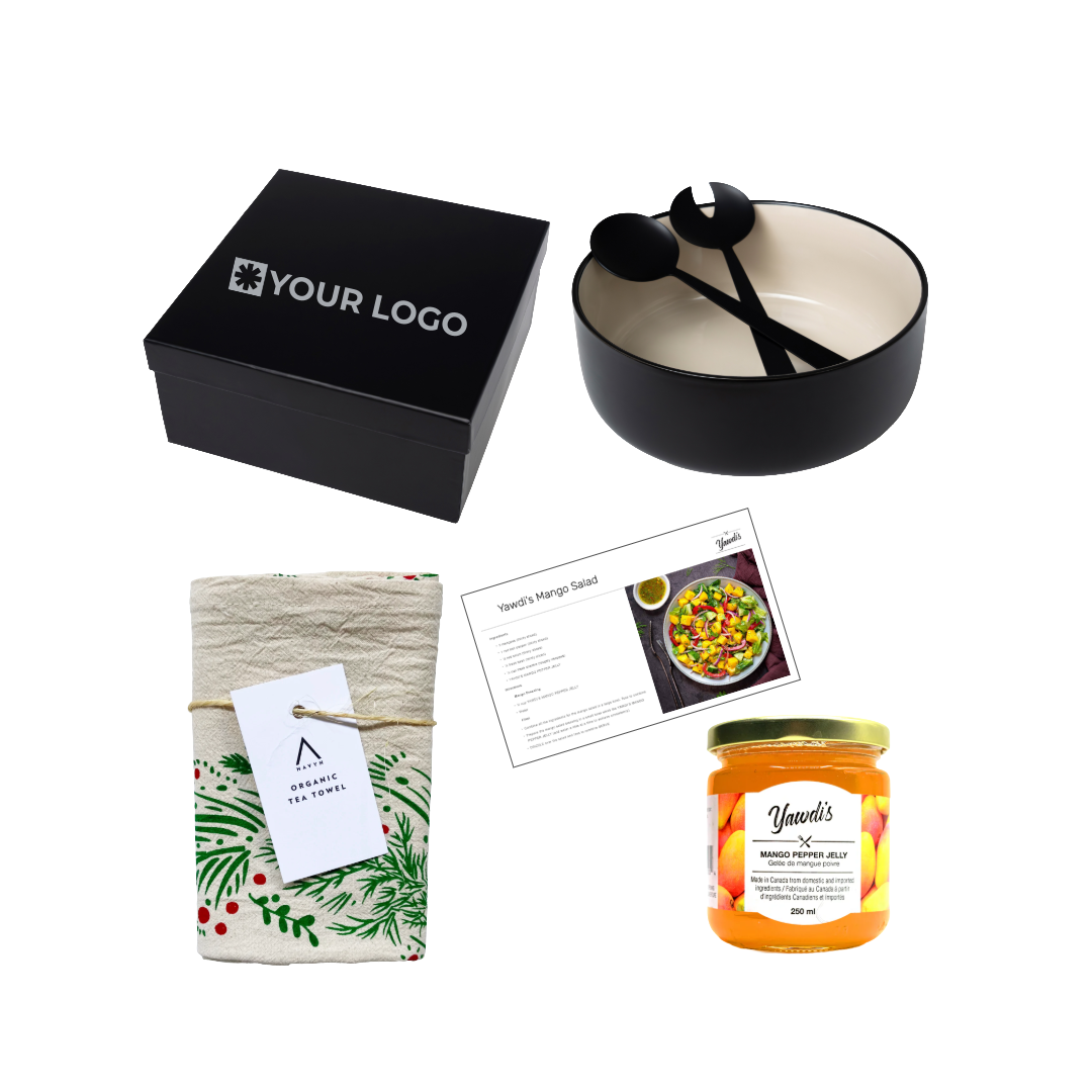 Celebrate connection with this thoughtfully curated bundle that brings freshness and meaning to the table. Featuring a porcelain salad bowl with utensils, a custom organic tea towel, and Yawdi’s Mango Pepper Jelly with a vinaigrette recipe card — all crafted by Toronto-based, women-owned small businesses. A beautiful way to thank clients or employees with a gift that inspires creativity, conversation, and community.
