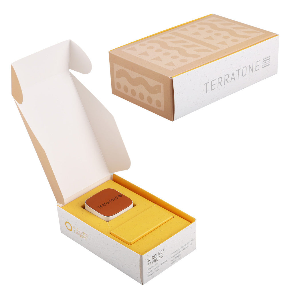 Meet TerraTone™ Wireless Earbuds - an eco-friendly, stylish audio solution. Crafted from recycled faux leather and recycled plastic, these earbuds embody sustainability without compromising on style. With touch button controls and a total playtime of 10 hours at 75% volume, they offer both convenience and functionality. The lightweight, compact design ensures comfort on the go. Presented in a carrying charging case, this set of earbuds signifies a new era of earth-conscious, portable audio technology.